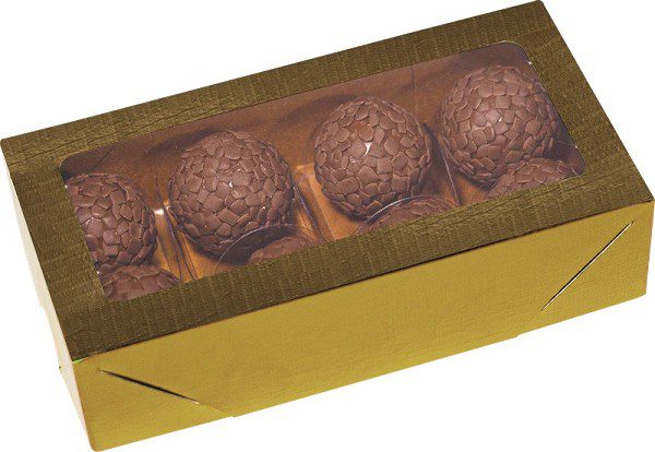CAIXA IDEIA DOURADA COM VISOR PARA 8 DOCES 16X8X4CM CÓD.4670